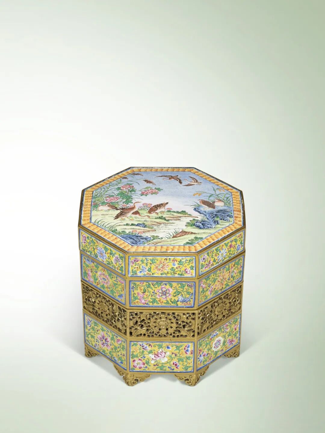 铜胎画珐琅八方雁安黄地番花暖砚